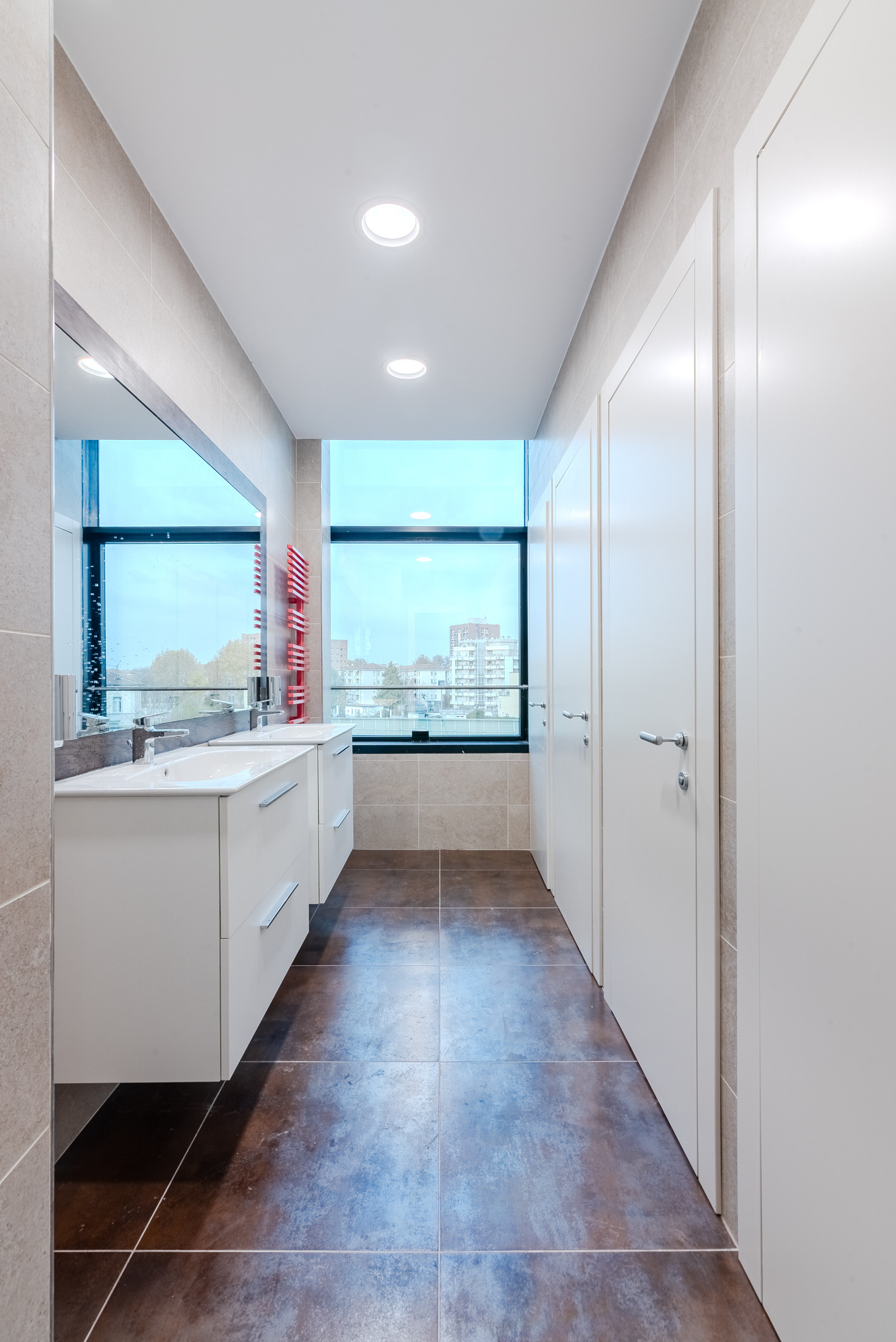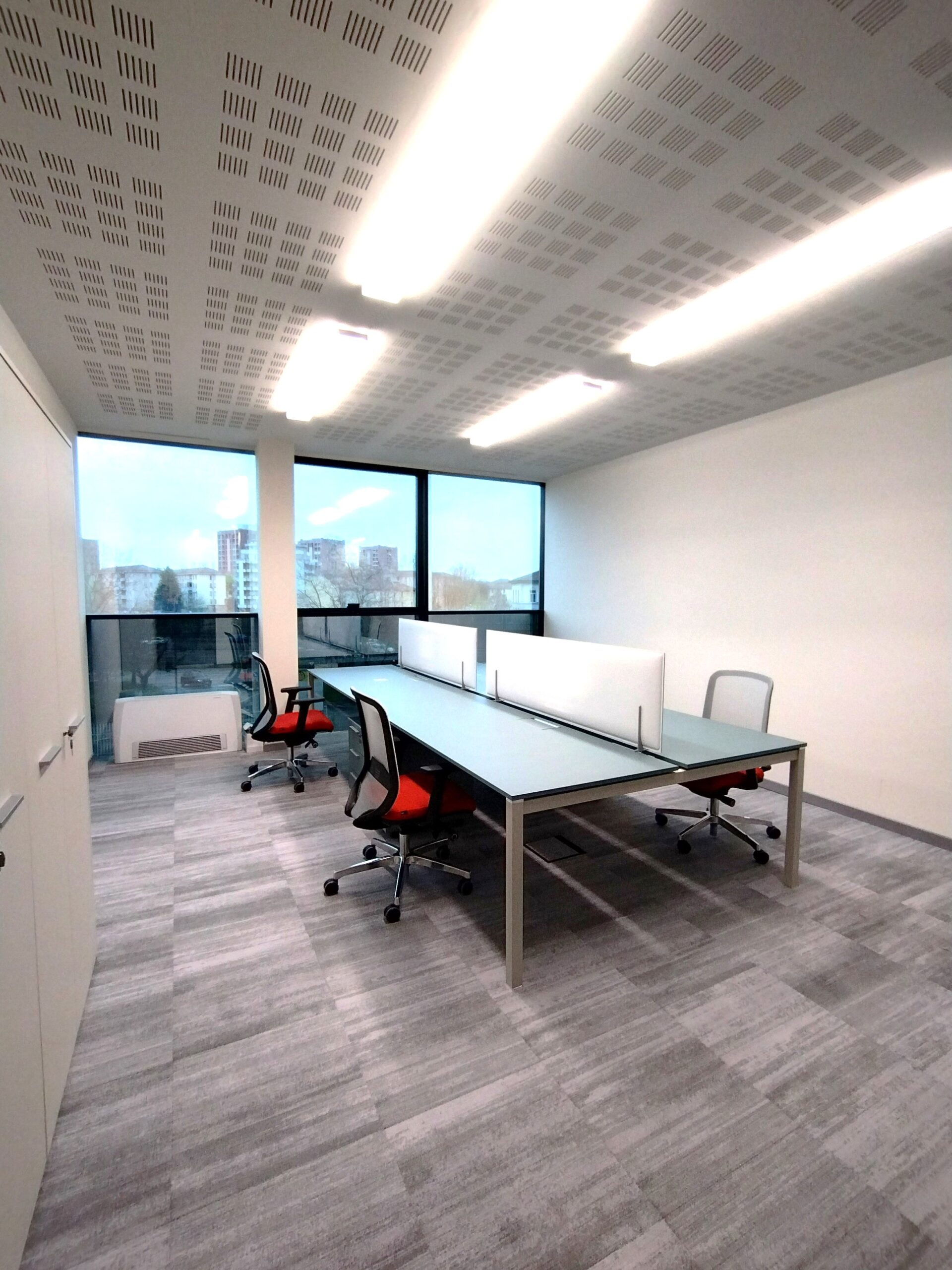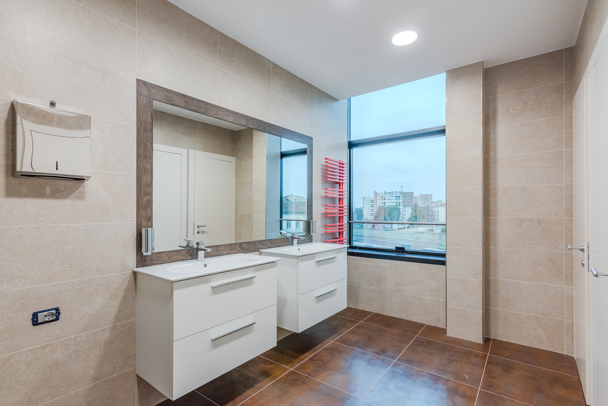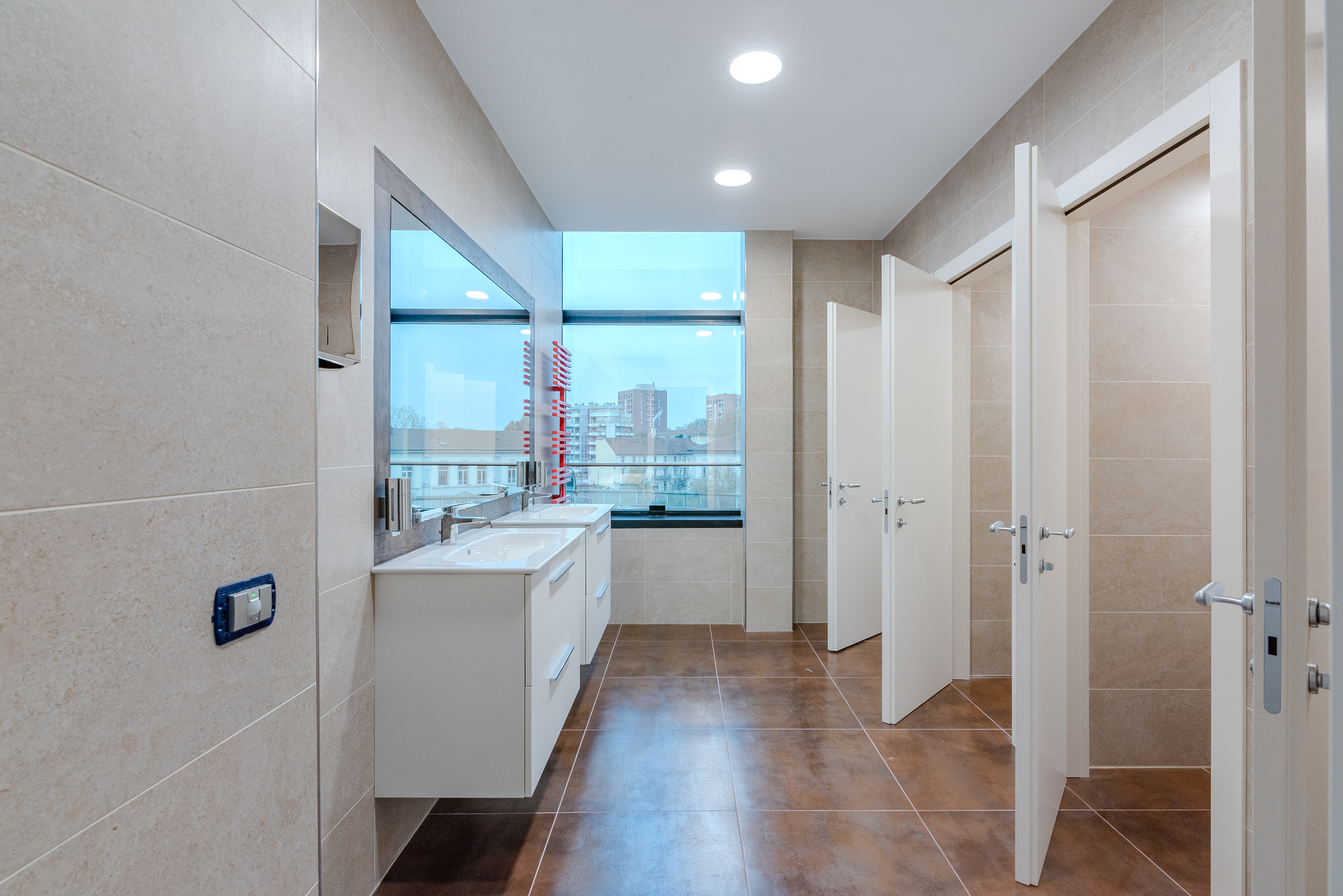 Riscaldamento e raffrescamento a fan coil, pavimento sopraelevato e controsoffitto fonoassorbente. La facciata continua assicura un notevole apporto di luce per il benessere dei lavoratori.